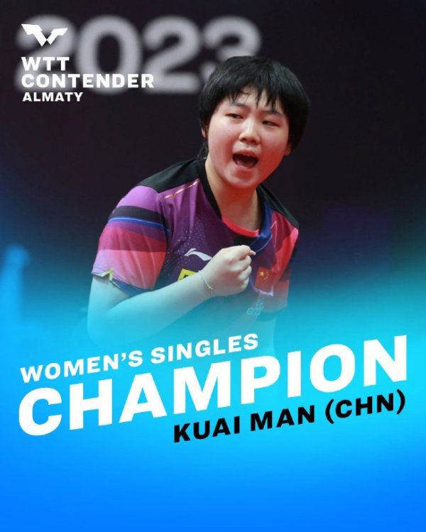 蒯曼 北京时间9月3日消息,2023年WTT常规挑战赛阿拉木图站落下帷幕,中国队拿到三项冠军。蒯曼表现不俗,她夺得女单和女双两项冠军,林诗栋/徐瑛彬夺得男双冠军。中国台北的林昀儒拿到男单冠军。 男单决赛里,向鹏虽然先胜一局,但之后两局他在关键球处理上没有做好,林昀儒连胜两局后越战越勇。最终林昀儒连扳四局,以4比1(4比11、12比10、15比13、11比9、11比7)战胜向鹏夺冠。 女单决赛是国乒德比战,蒯曼以4比0(11比6、12比10、11比8、11比6)战胜范思琦夺冠。......查看更多
