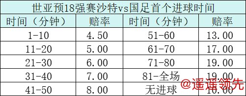 从上表中可以看出,比赛的首粒进球出现在前十分钟的赔率为1赔4.50,开元棋牌官方网站在所有的时间段选项中是最低的,这也预示着沙特进球的出现似乎不用等待太久。那么,是谁更可能先进球呢?在另一个选项中,知名机构给出了看法。首个进球球队的选项中,沙特的赔率为1.30,而作客的中国赔率为4.00,所以沙特开场先发制人的可能性更大。