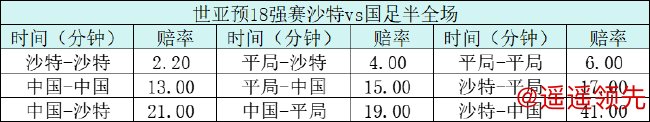 从表中可以看出,沙特半场赢-全场赢的赔率为1赔2.20,半场平局最后是沙特主胜的赔率为1赔4.00。而出现半场逆转的局面,赔率分别是1赔21和1赔41,也预示着这种情况发生的可能并不大。而半场平局-全场平局也只有6.00,所以中国男足能否在上半场扛住沙特的进攻对于整场比赛结果来说,可谓至关重要。