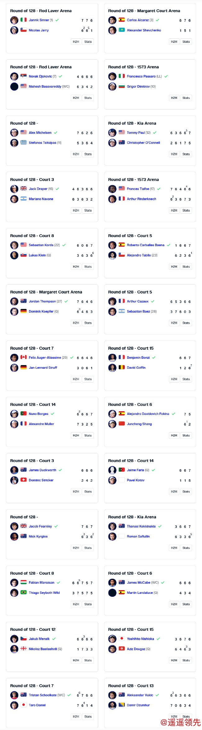 2025澳网公开赛正赛于当地时间1月12-26日在澳大利亚墨尔本举行。由于首日有多场比赛因雨取消,最终,第二比赛日男单共进行了26场比赛。